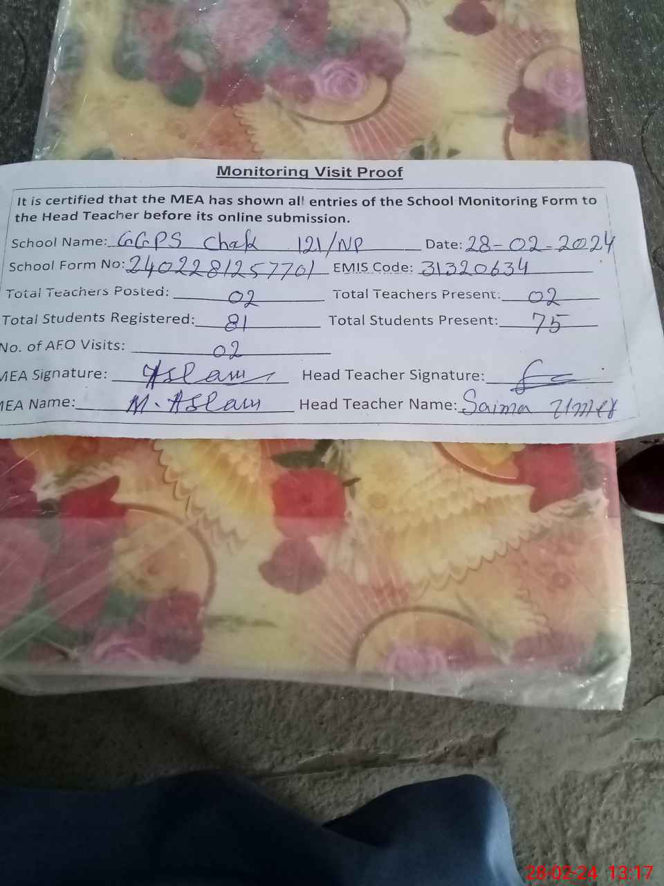 | Attendance Register | Head Teacher | MEA with School | Visit Proof |
