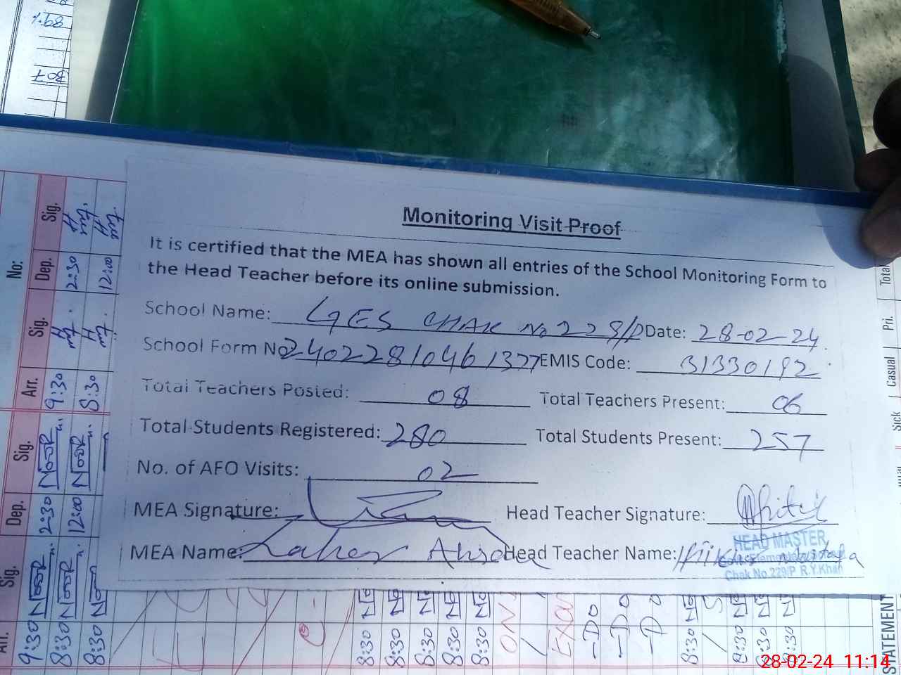 | Attendance Register | Head Teacher | MEA with School | Visit Proof |