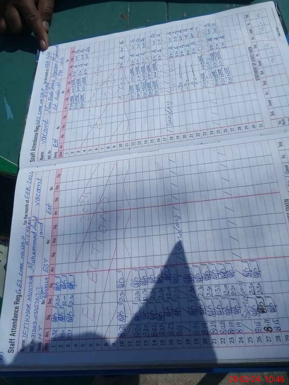 | CNIC | Full Name | Designation | R/C | Absence During Last Calender Month |