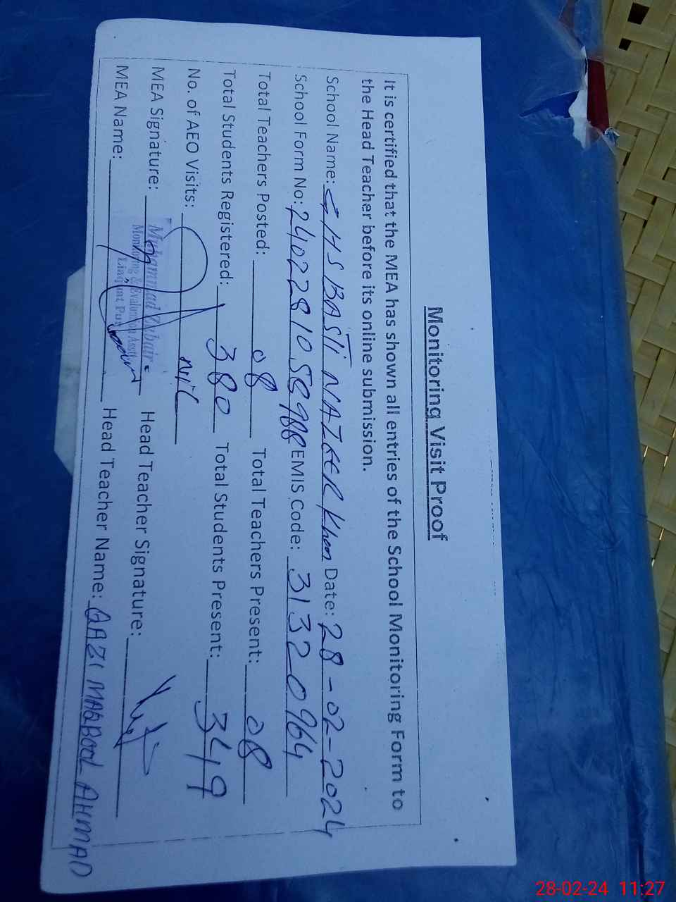 | Attendance Register | Head Teacher | MEA with School | Visit Proof |