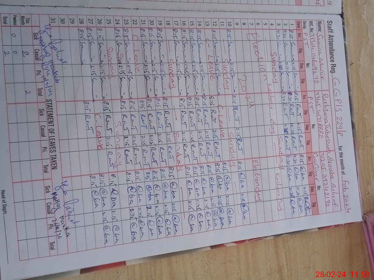 | CNIC | Full Name | Designation | R/C | Absence During Last Calender Month |