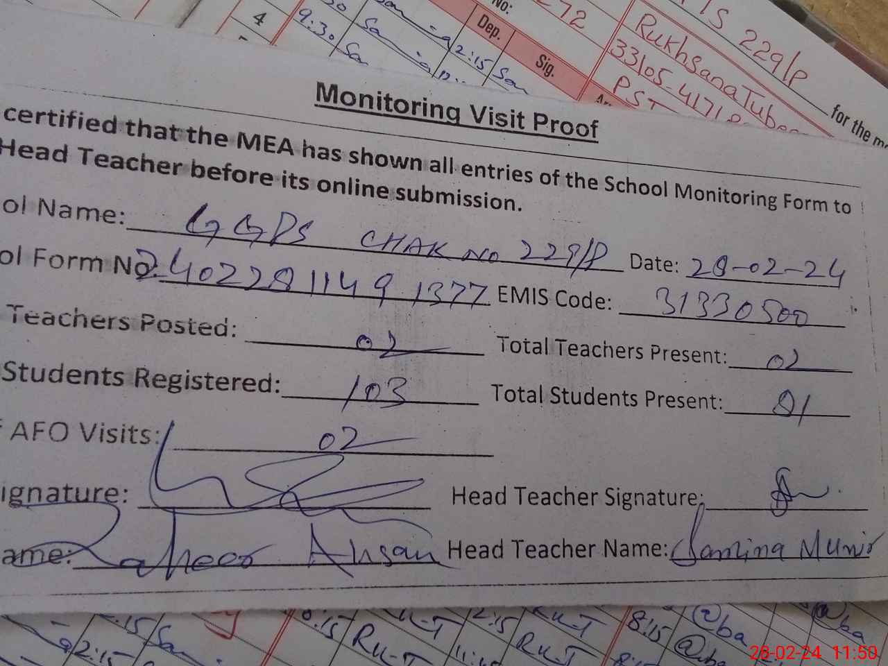 | Attendance Register | Head Teacher | MEA with School | Visit Proof |