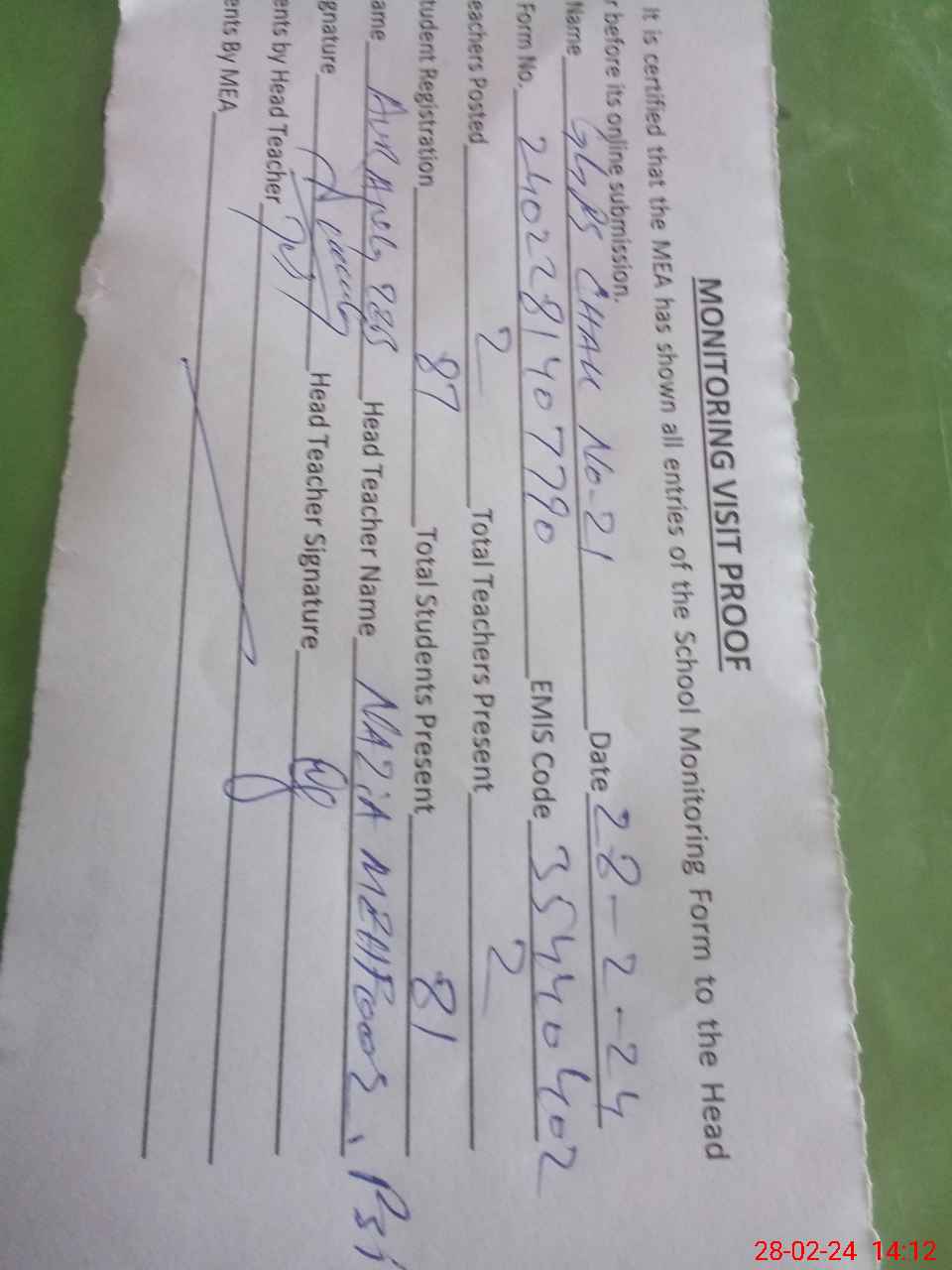 | Attendance Register | Head Teacher | MEA with School | Visit Proof |