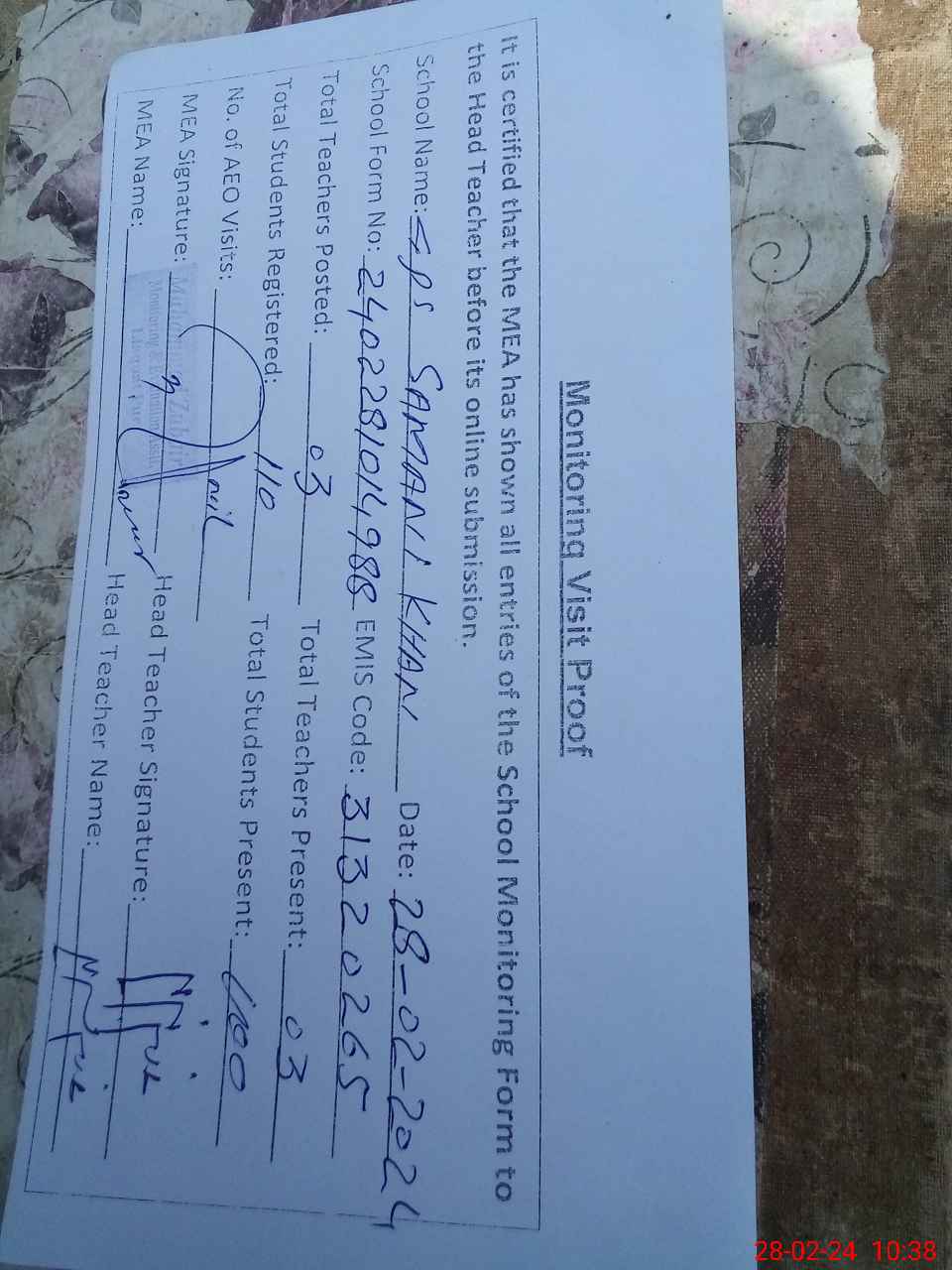 | Attendance Register | Head Teacher | MEA with School | Visit Proof |