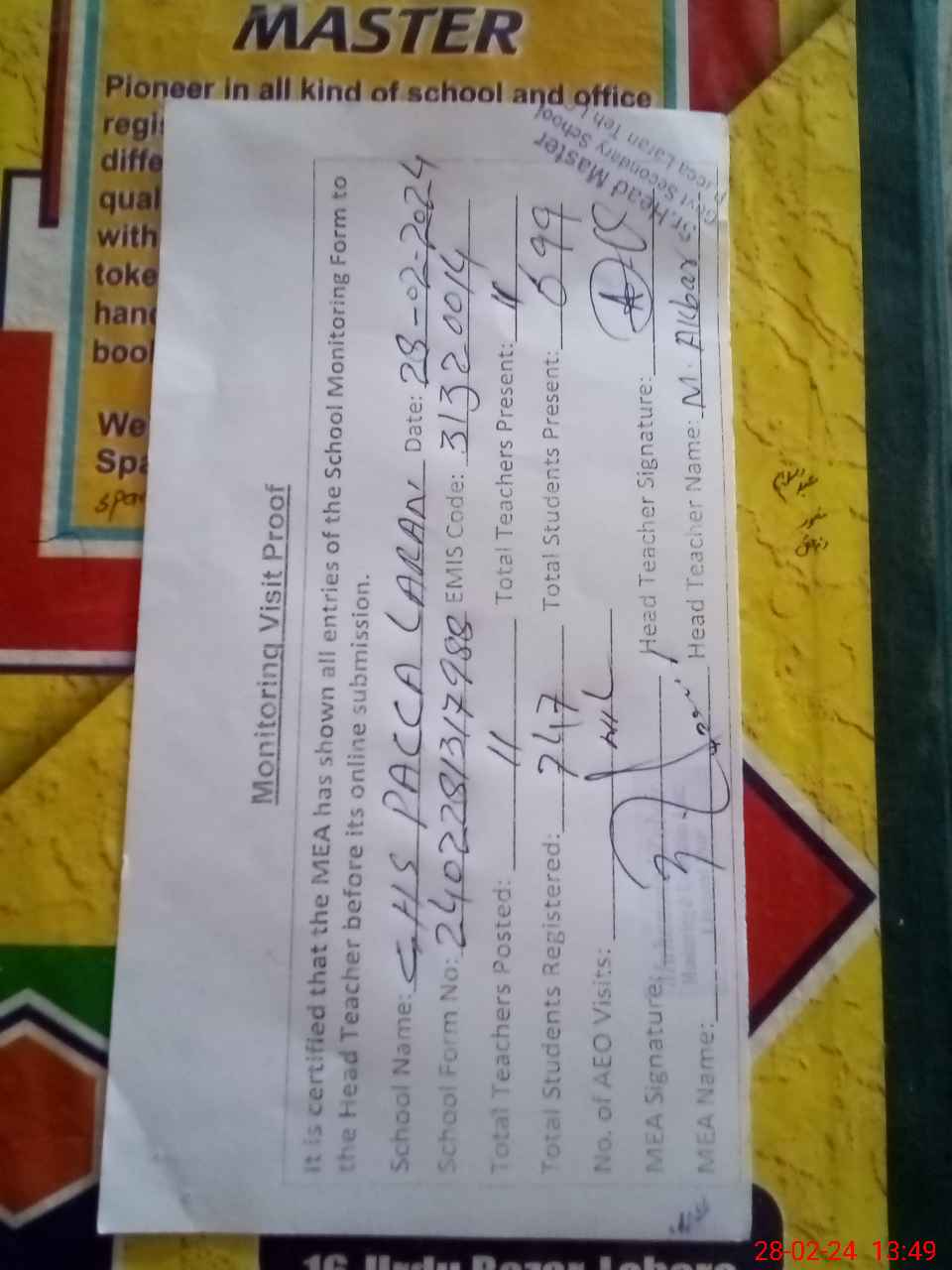 | Certified that this School was Inspected by the Undersigned MEA/DMO Today and the Information Stated Above is as Per Record. | |||||