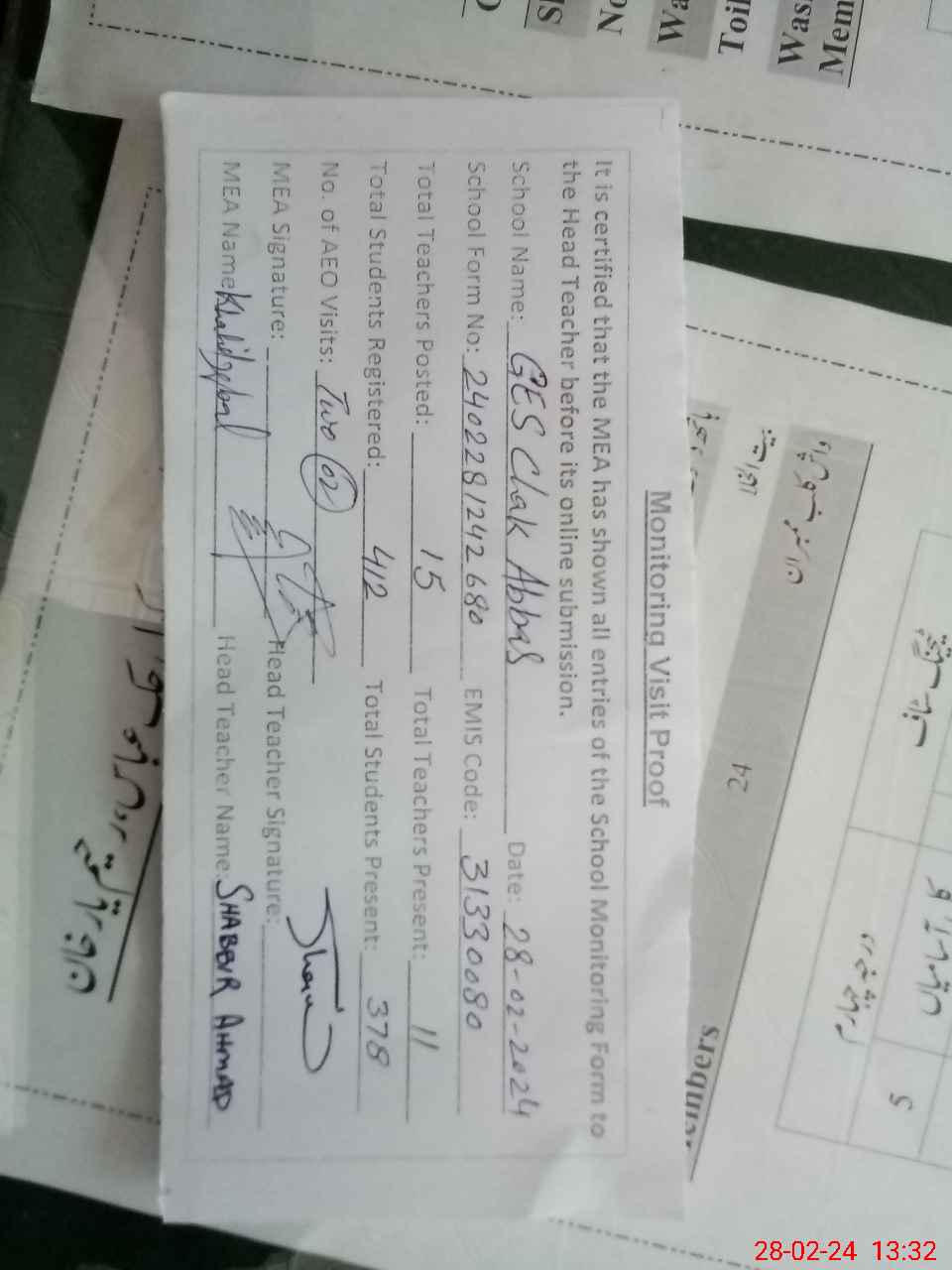 | Attendance Register | Head Teacher | MEA with School | Visit Proof |