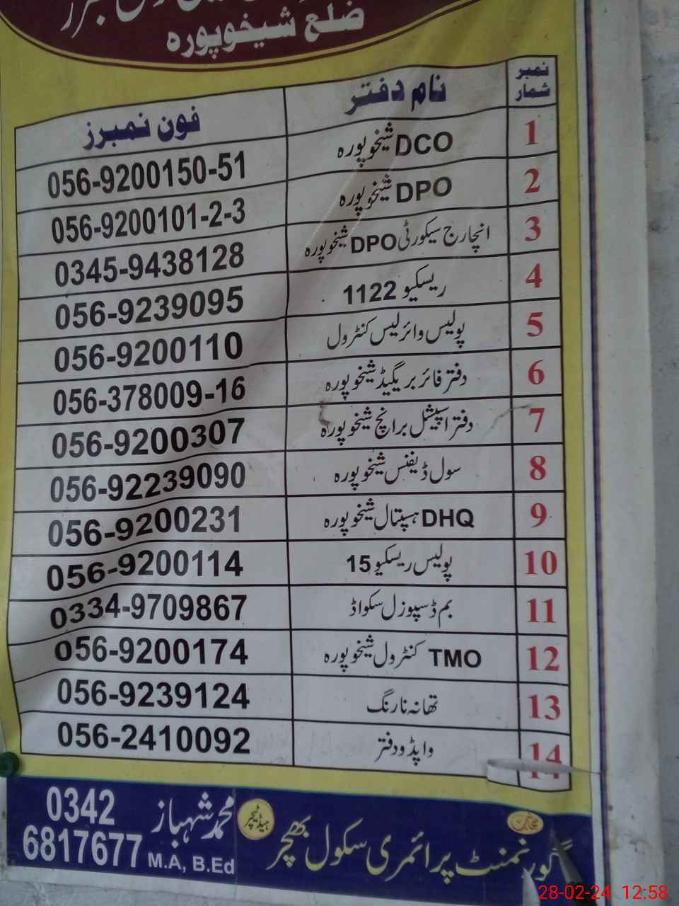 | District: SHEIKHUPURA | Tehsil: MURIDKE | Markaz: MURAD PUR-MALE | Level: Primary | |
