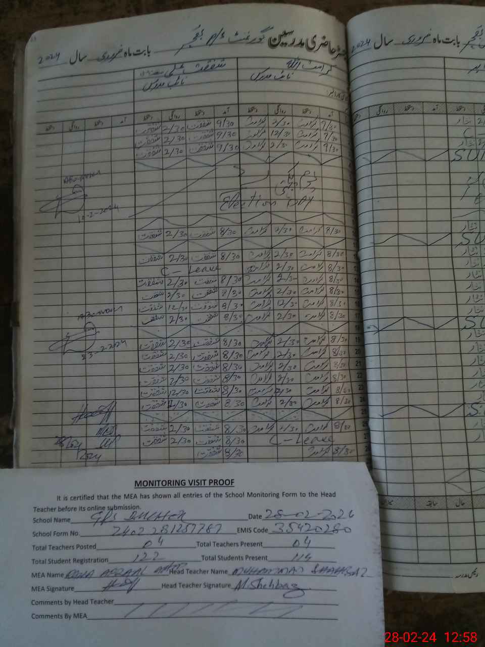 | Attendance Register | Head Teacher | MEA with School | Visit Proof |