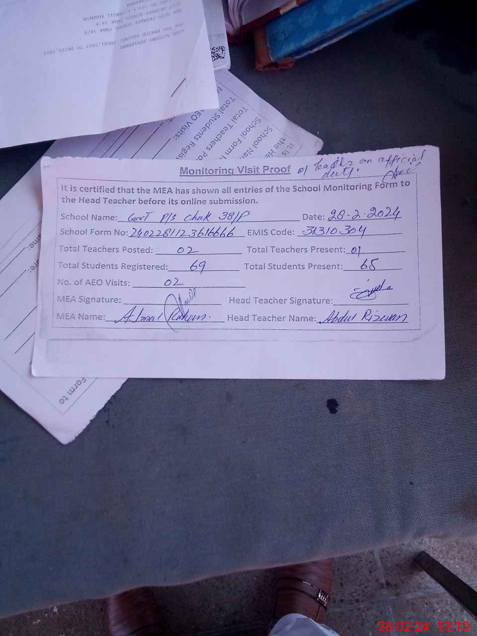 | Attendance Register | Head Teacher | MEA with School | Visit Proof |