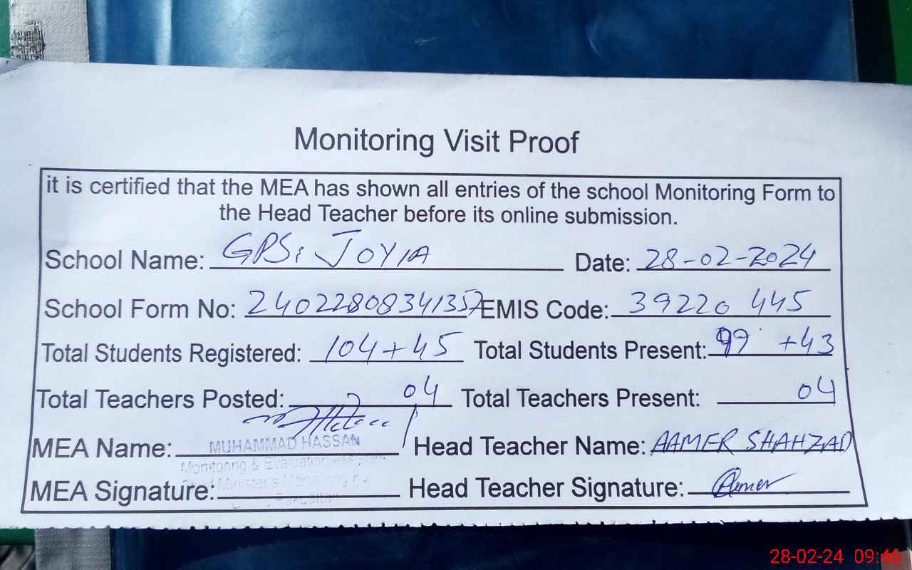 | EMIS Code: 39220445 | Name of School: GPS JOYIA P.O NOORA PATH ARIF WALA | |||