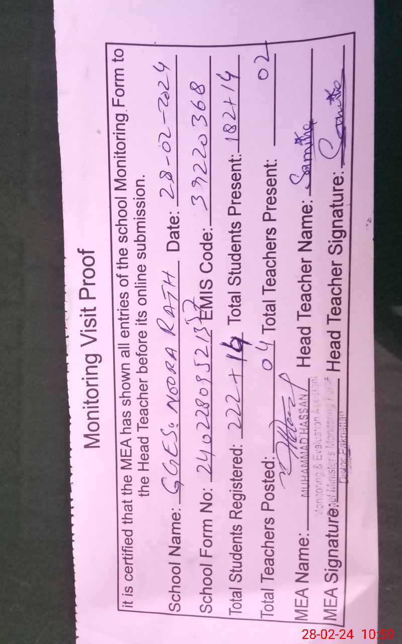 | EMIS Code: 39220368 | Name of School: GGES NOORA RATH NO.1 TEH.ARIFWALA | |||