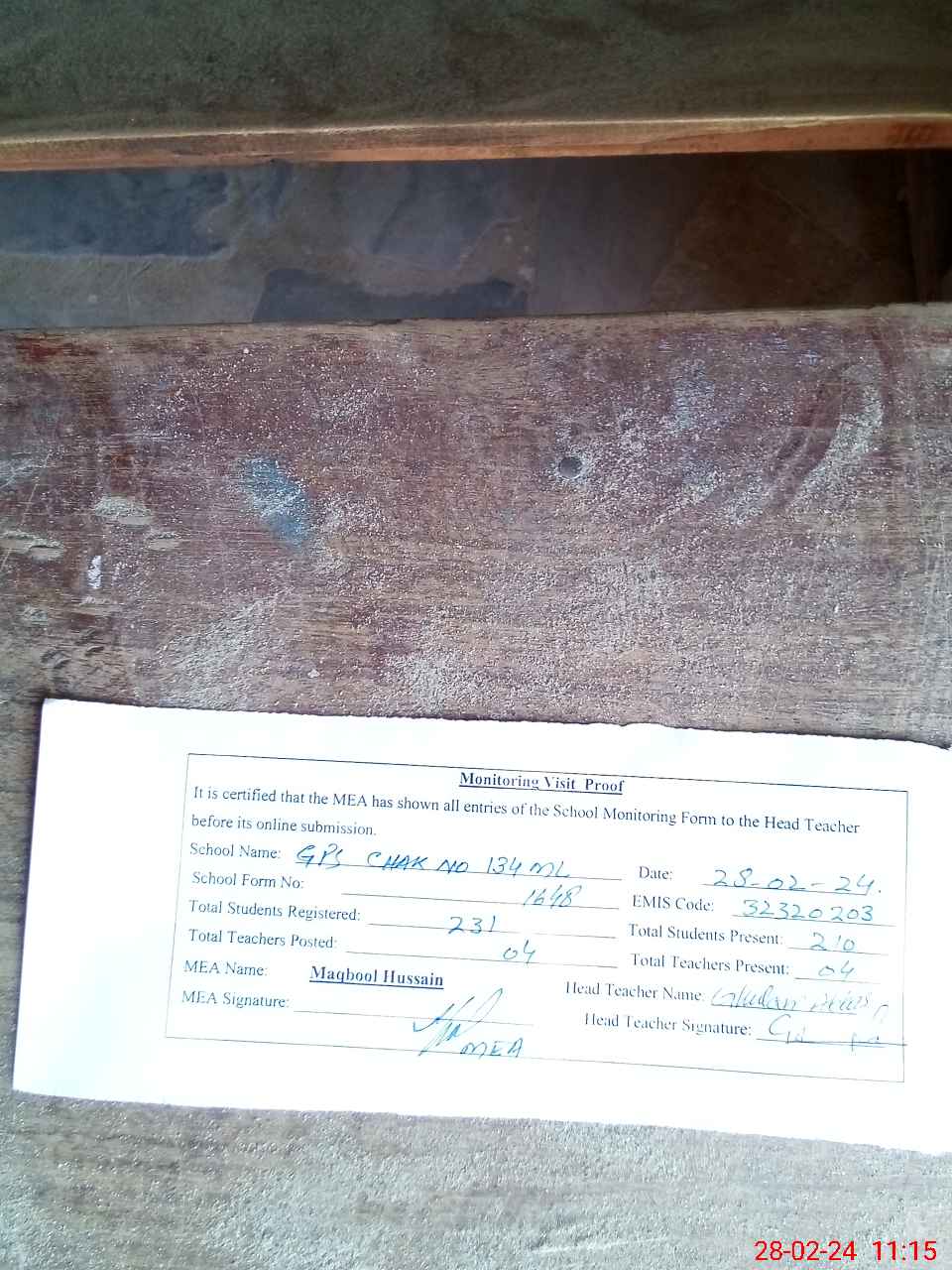 | Attendance Register | Head Teacher | MEA with School | Visit Proof |