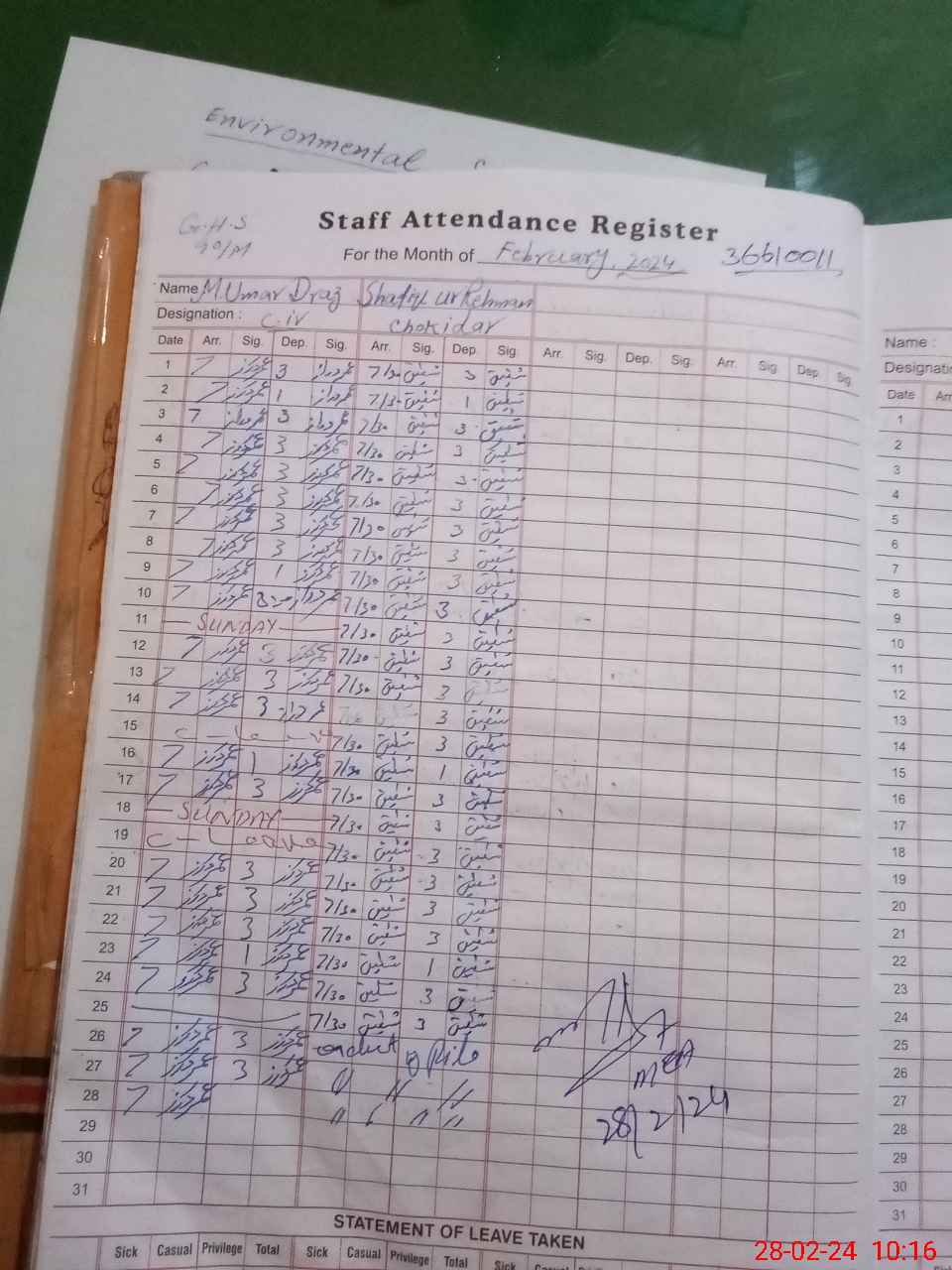 | CNIC | Full Name | Designation | R/C | Absence During Last Calender Month |