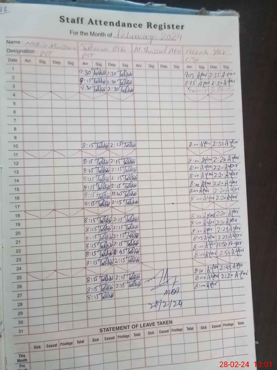 | CNIC | Full Name | Designation | R/C | Absence During Last Calender Month |