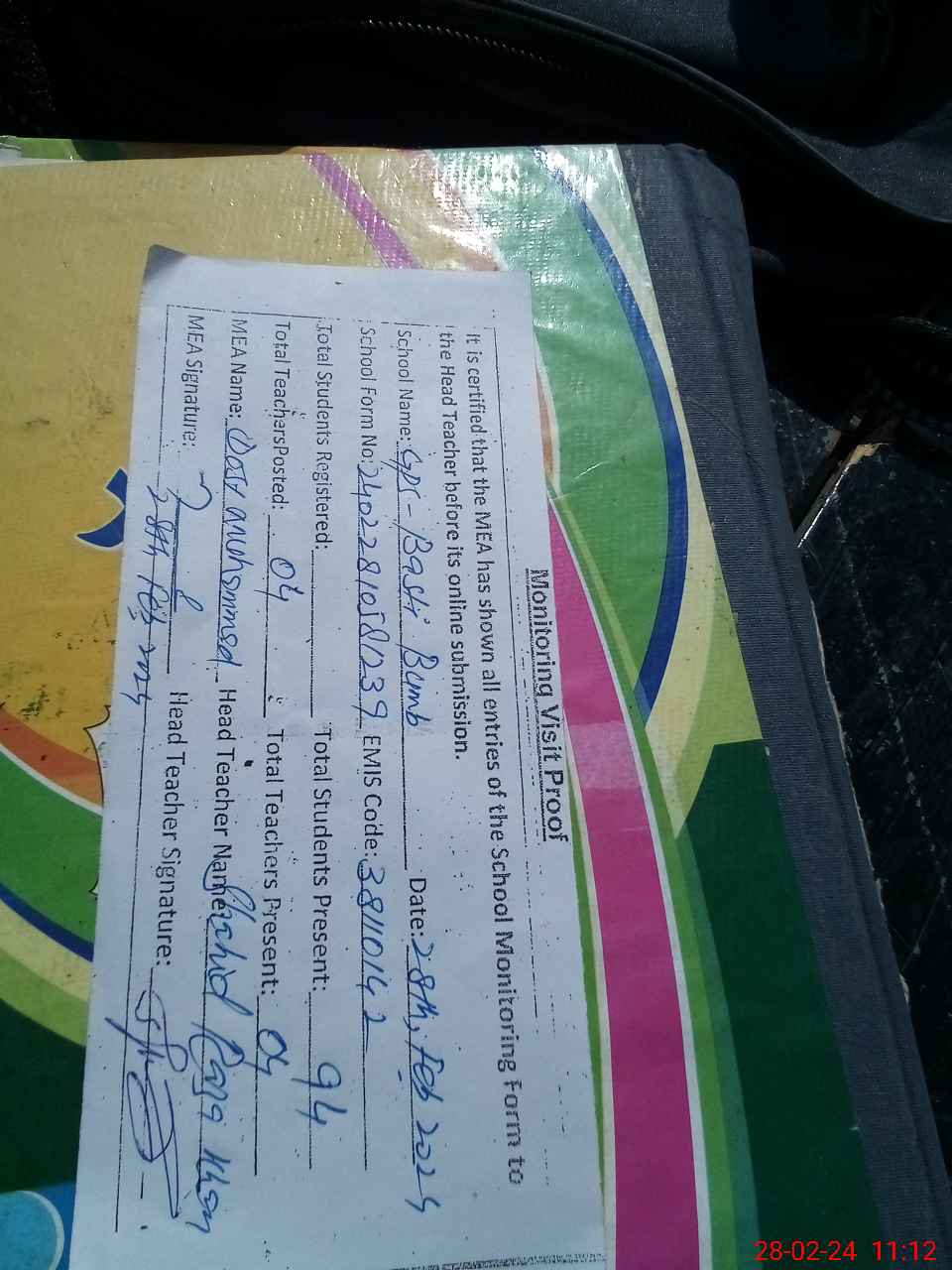 | EMIS Code: 38110142 | Name of School: GPS BASTI BUMB | |||
