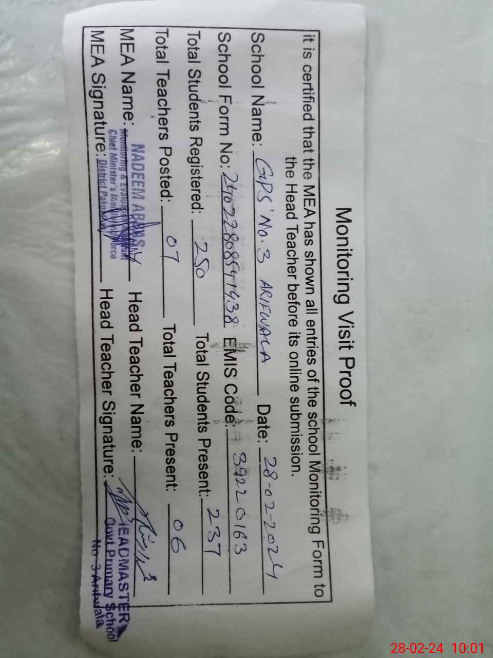 | EMIS Code: 39220163 | Name of School: GPS NO. 3 ARIFWALA | |||