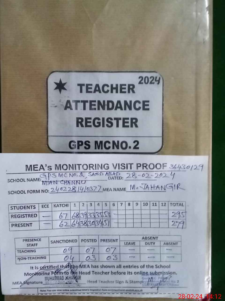 | Attendance Register | Head Teacher | MEA with School | Visit Proof |