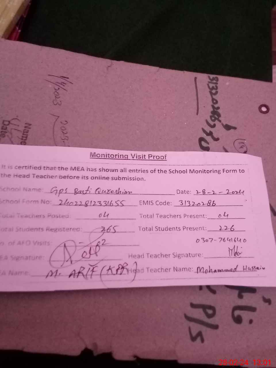 | Name: MU**** HU**** Designation: (School Headmaster's/Headmistress's) PST/PTC/JV Phone/Cell Number: 03**** |