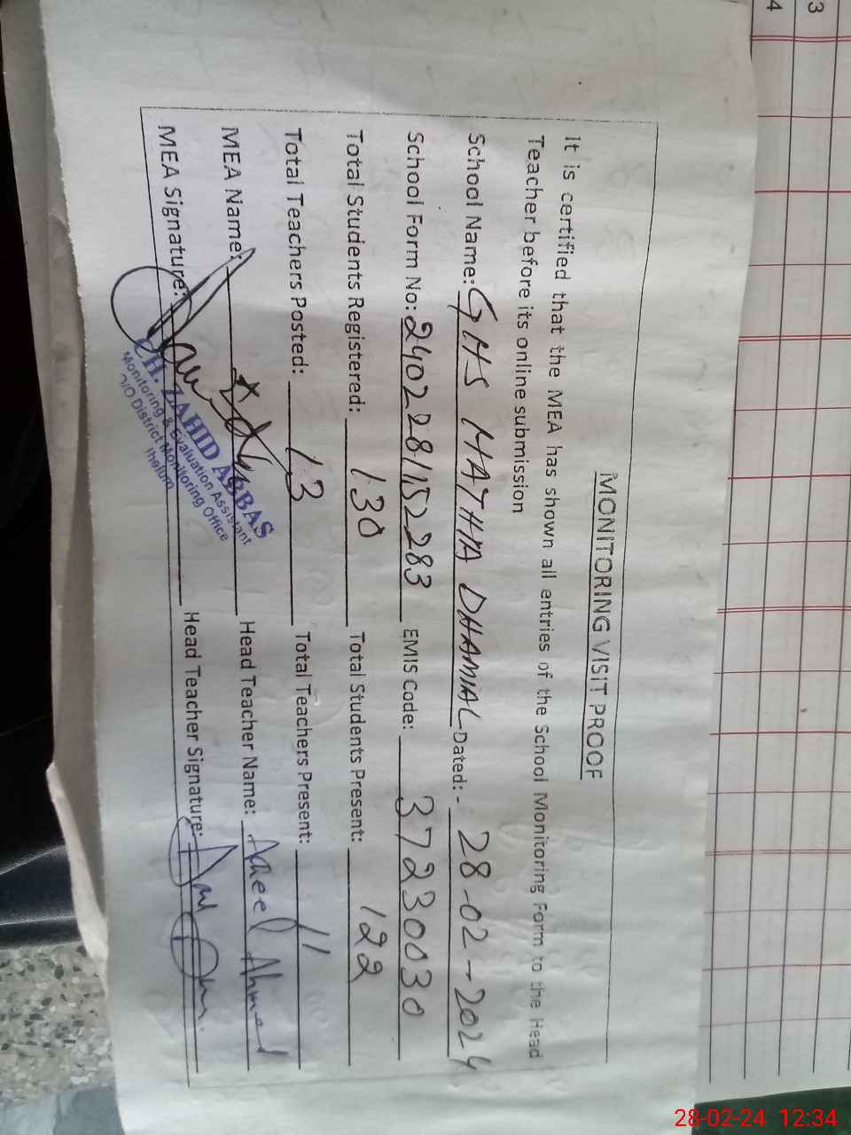 | Monitoring Date: 28-02-2024 | Start Time: 28-02-2024 11:52 AM | End Time: 28-02-2024 12:37 PM | Name of MEA: Za**** Ab**** | |