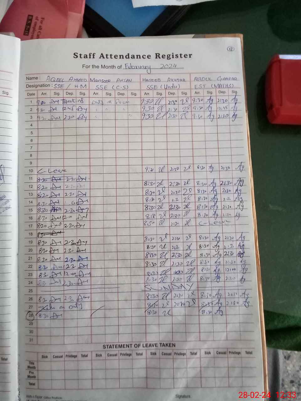 | Leave | Duty | Absent | Maternity | Medical | Ex- Pak |