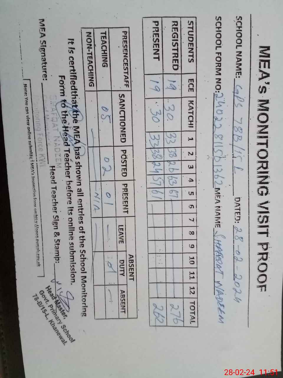 | Attendance Register | Head Teacher | MEA with School | Visit Proof |