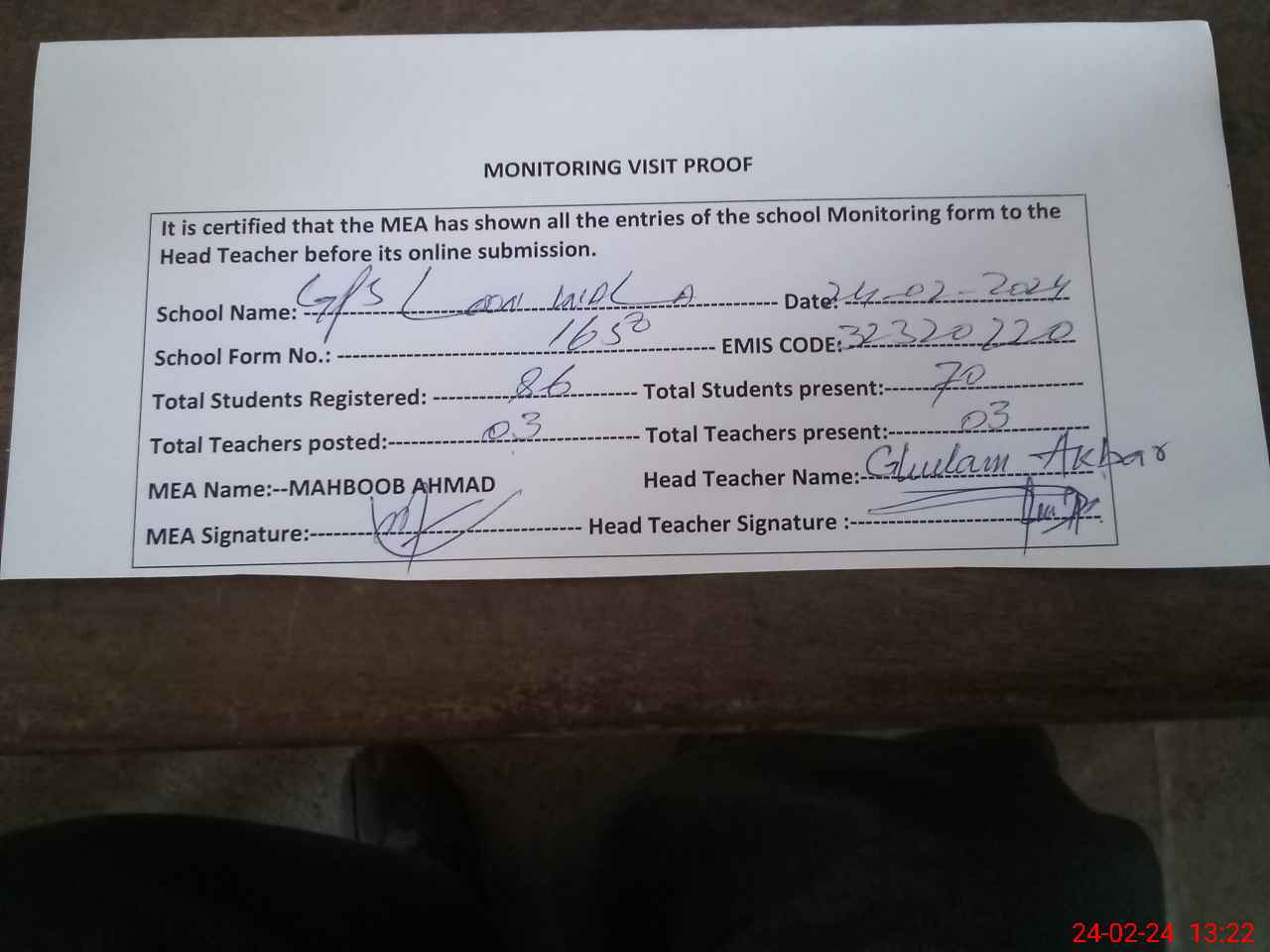 | Name: GH**** AK**** Designation: (School Headmaster's/Headmistress's) /PTC Phone/Cell Number: 03**** |
