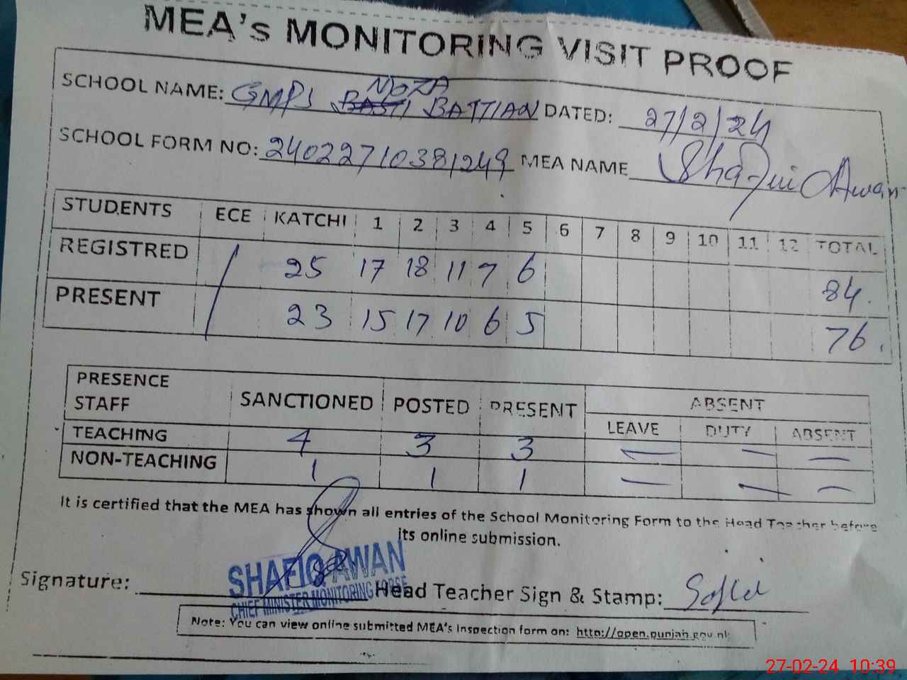 | Attendance Register | Head Teacher | MEA with School | Visit Proof |