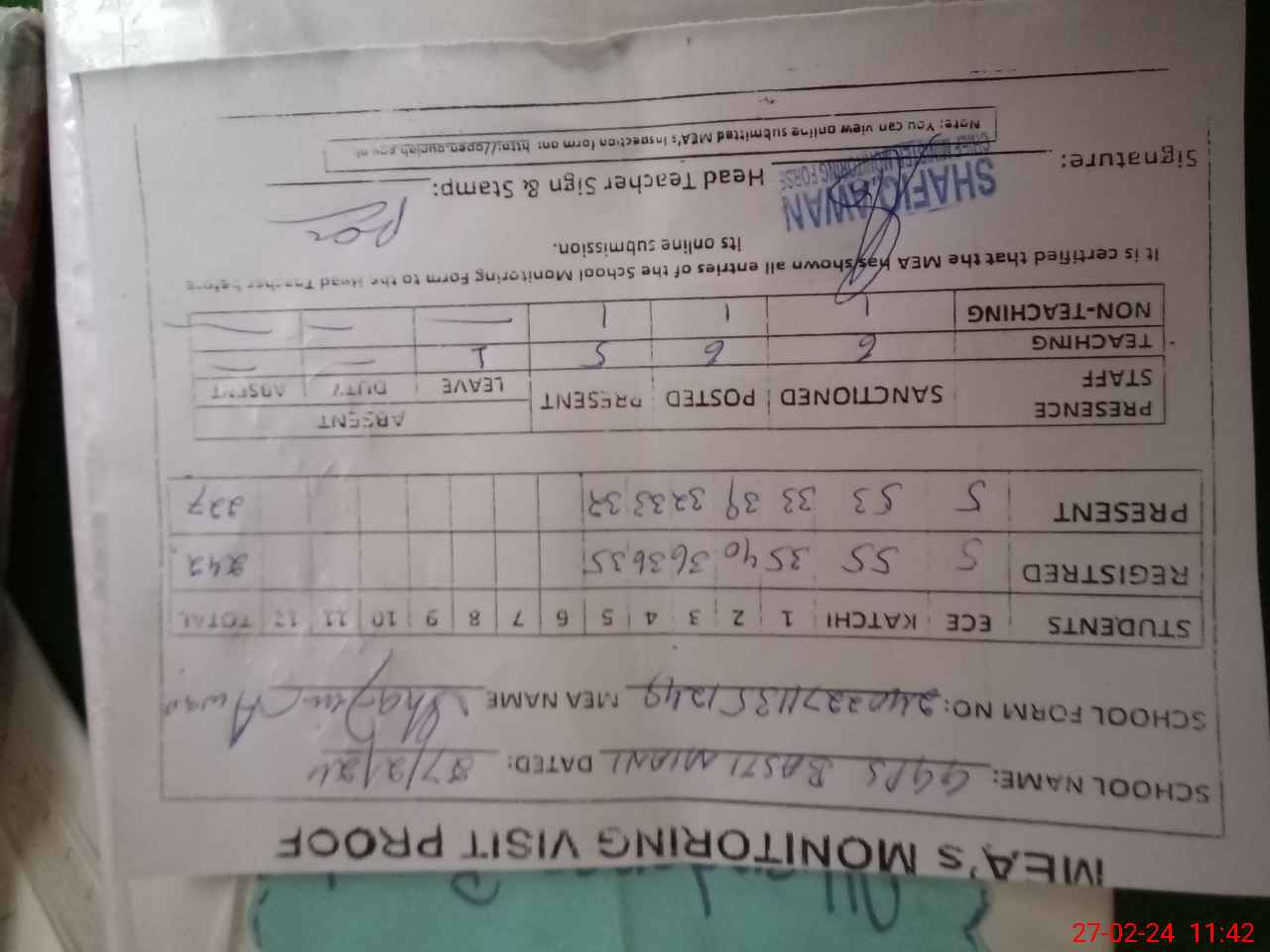 | Attendance Register | Head Teacher | MEA with School | Visit Proof |