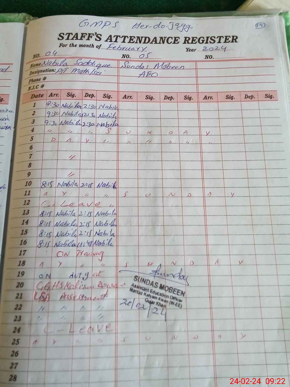 | CNIC | Full Name | Designation | R/C | Absence During Last Calender Month |