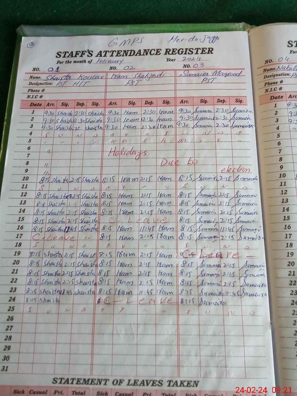| Leave | Duty | Absent | Maternity | Medical | Ex- Pak |