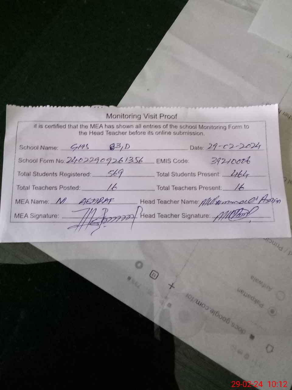 | Attendance Register | Head Teacher | MEA with School | Visit Proof |