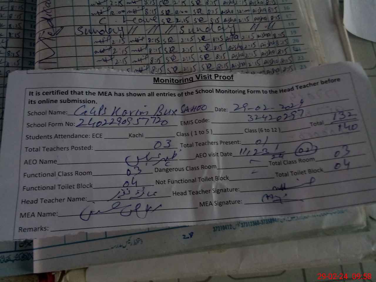 | Attendance Register | Head Teacher | MEA with School | Visit Proof |
