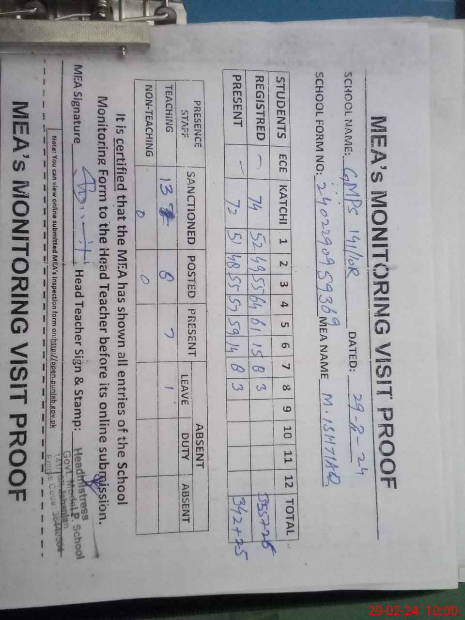 | Attendance Register | Head Teacher | MEA with School | Visit Proof |