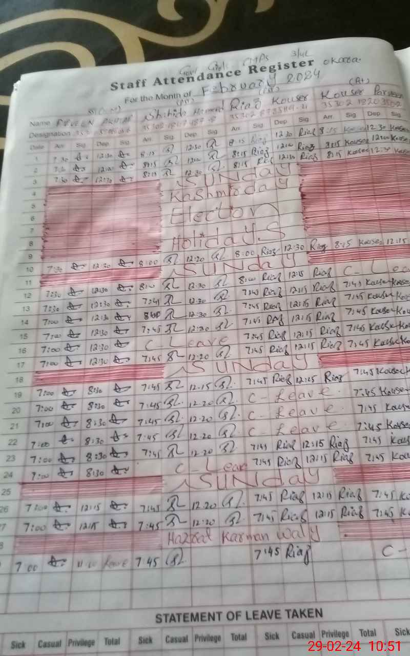 | CNIC | Full Name | Designation | R/C | Absence During Last Calender Month |