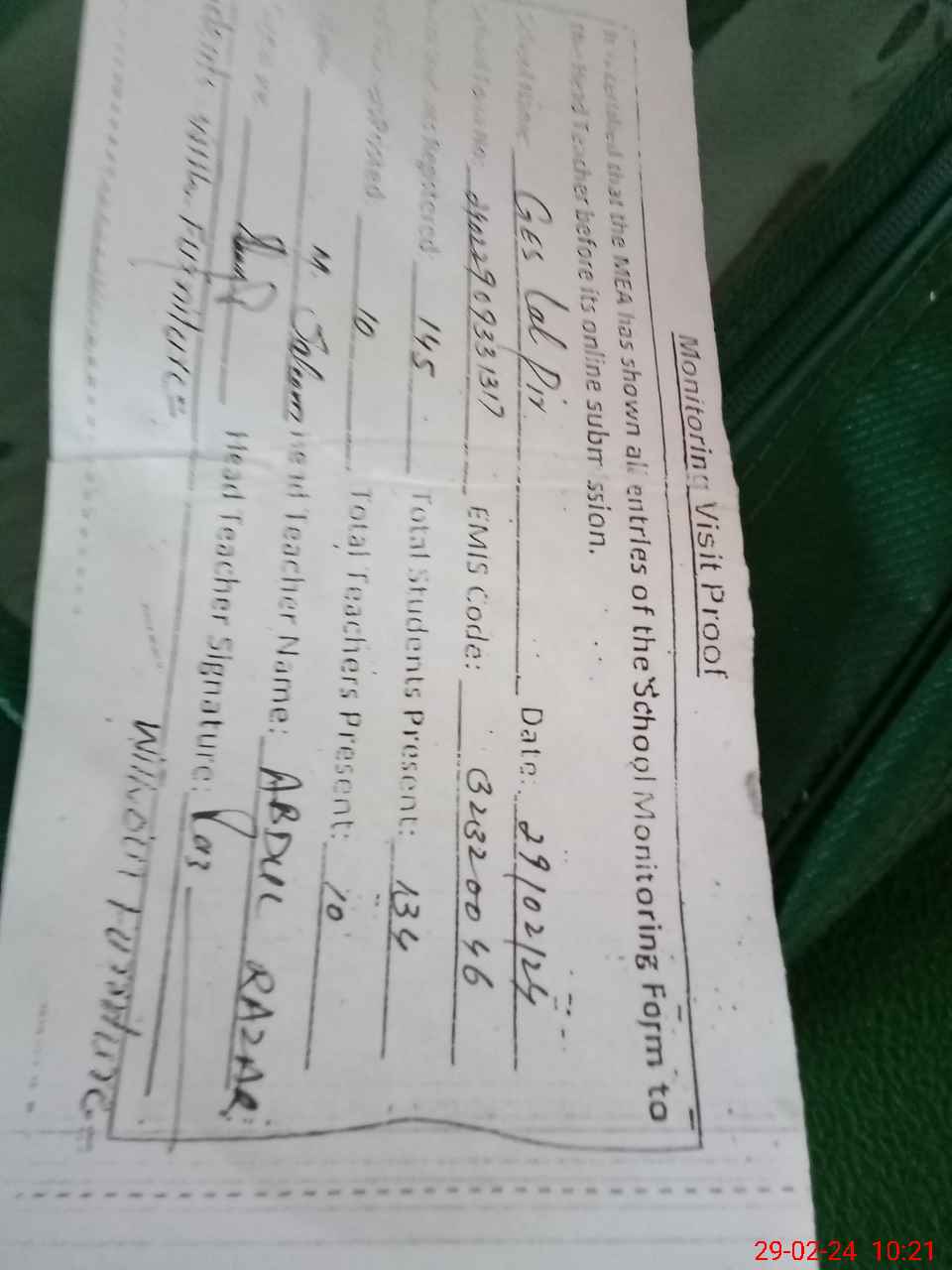 | Attendance Register | Head Teacher | MEA with School | Visit Proof |