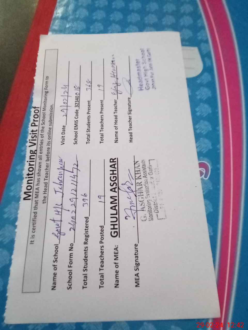 | Attendance Register | Head Teacher | MEA with School | Visit Proof |