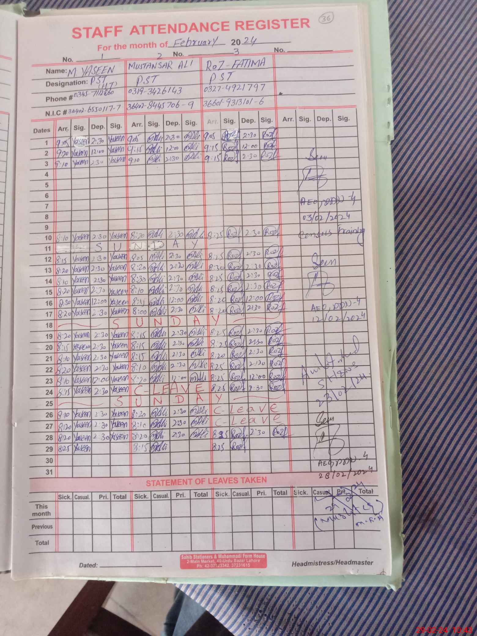 | CNIC | Full Name | Designation | R/C | Absence During Last Calender Month |