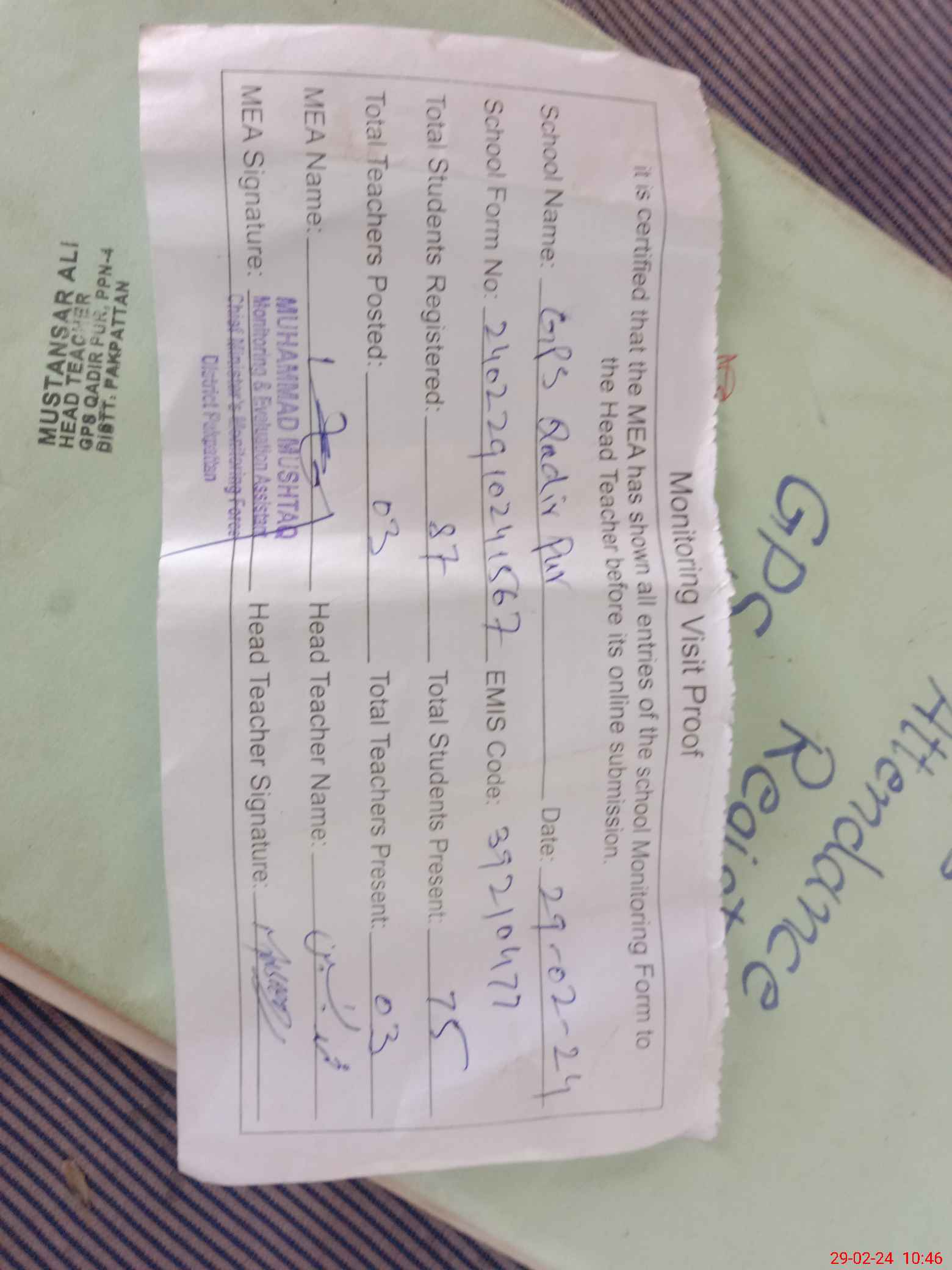 | Name: Mu**** Al**** Designation: (School Headmaster's/Headmistress's) PST Phone/Cell Number: 03**** |
