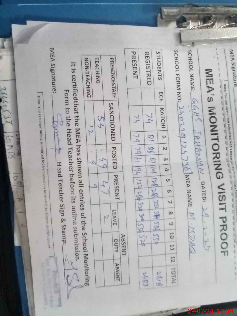| Certified that this School was Inspected by the Undersigned MEA/DMO Today and the Information Stated Above is as Per Record. | |||||