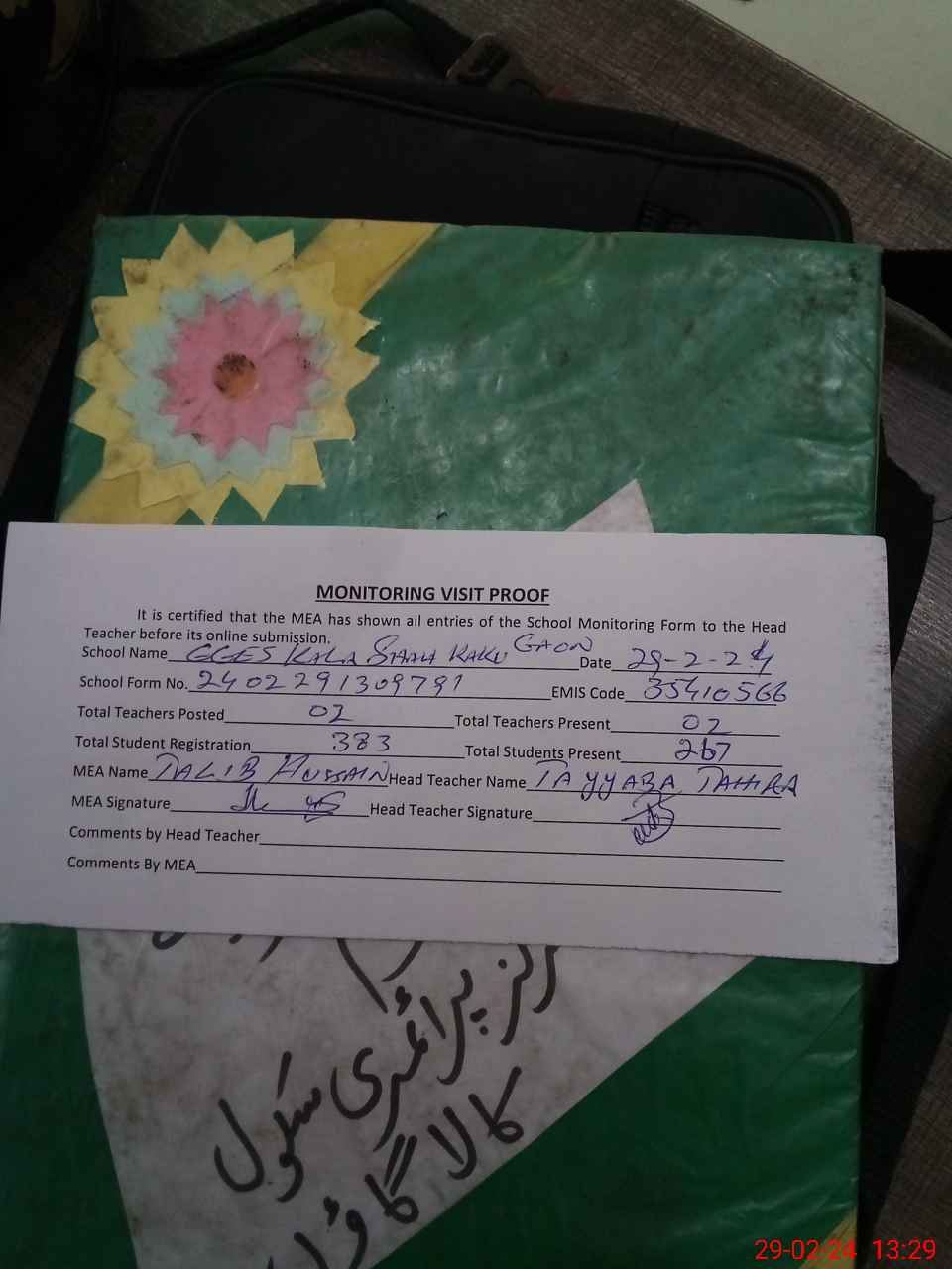| Attendance Register | Head Teacher | MEA with School | Visit Proof |