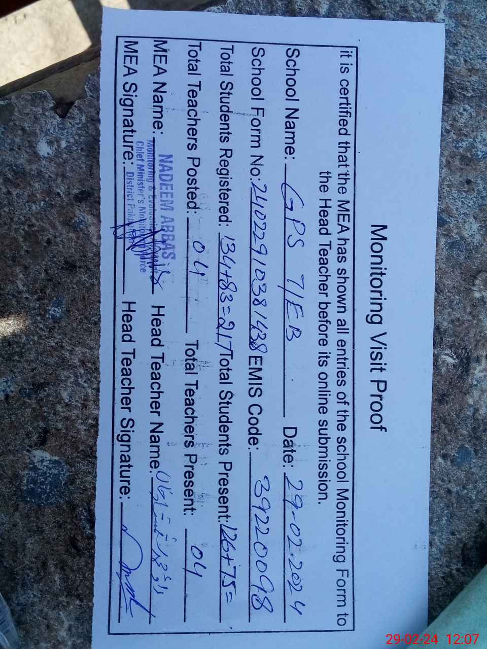 | Attendance Register | Head Teacher | MEA with School | Visit Proof |