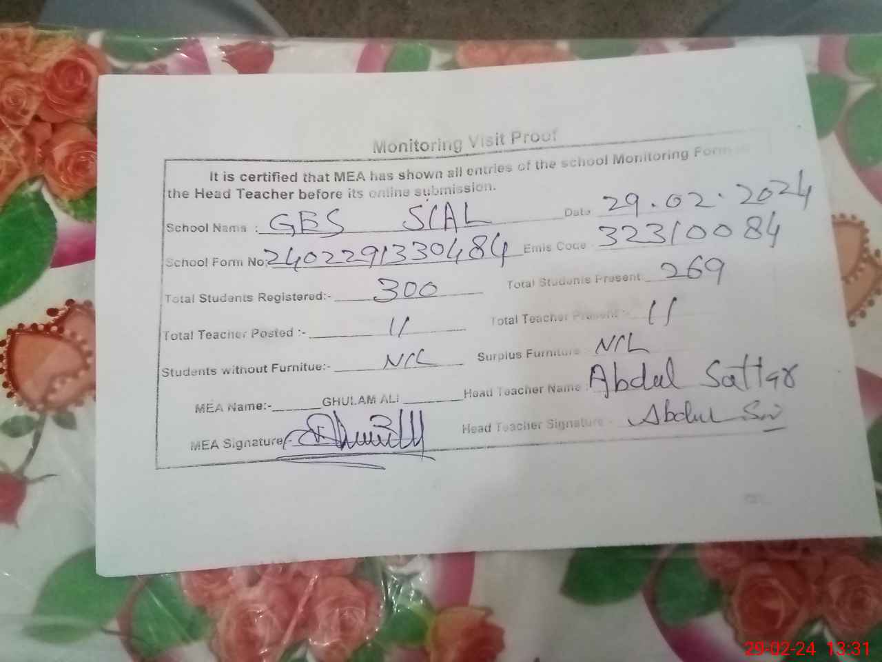 | Attendance Register | Head Teacher | MEA with School | Visit Proof |