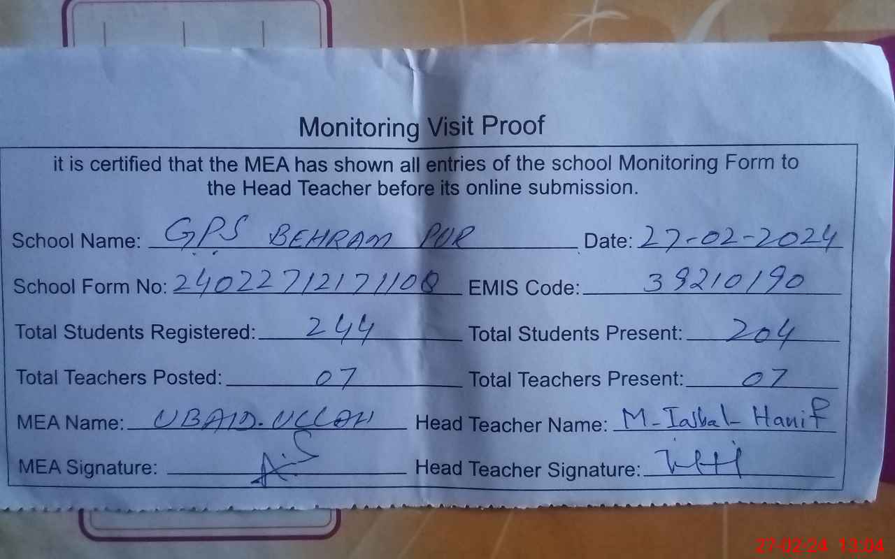 | EMIS Code: 39210190 | Name of School: GPS BEHRAM PUR PO PAKPATTAN | |||