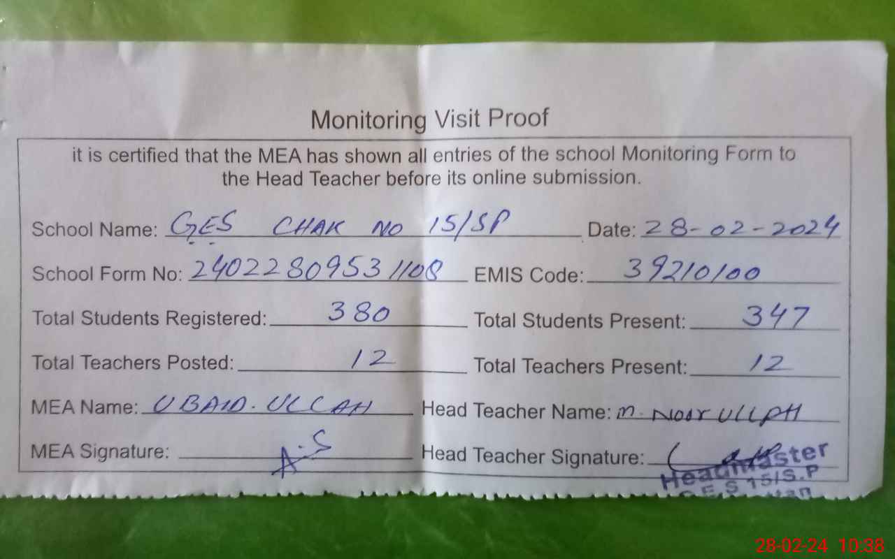 | EMIS Code: 39210100 | Name of School: GES 15/SP P.O PAKPATTAN | |||