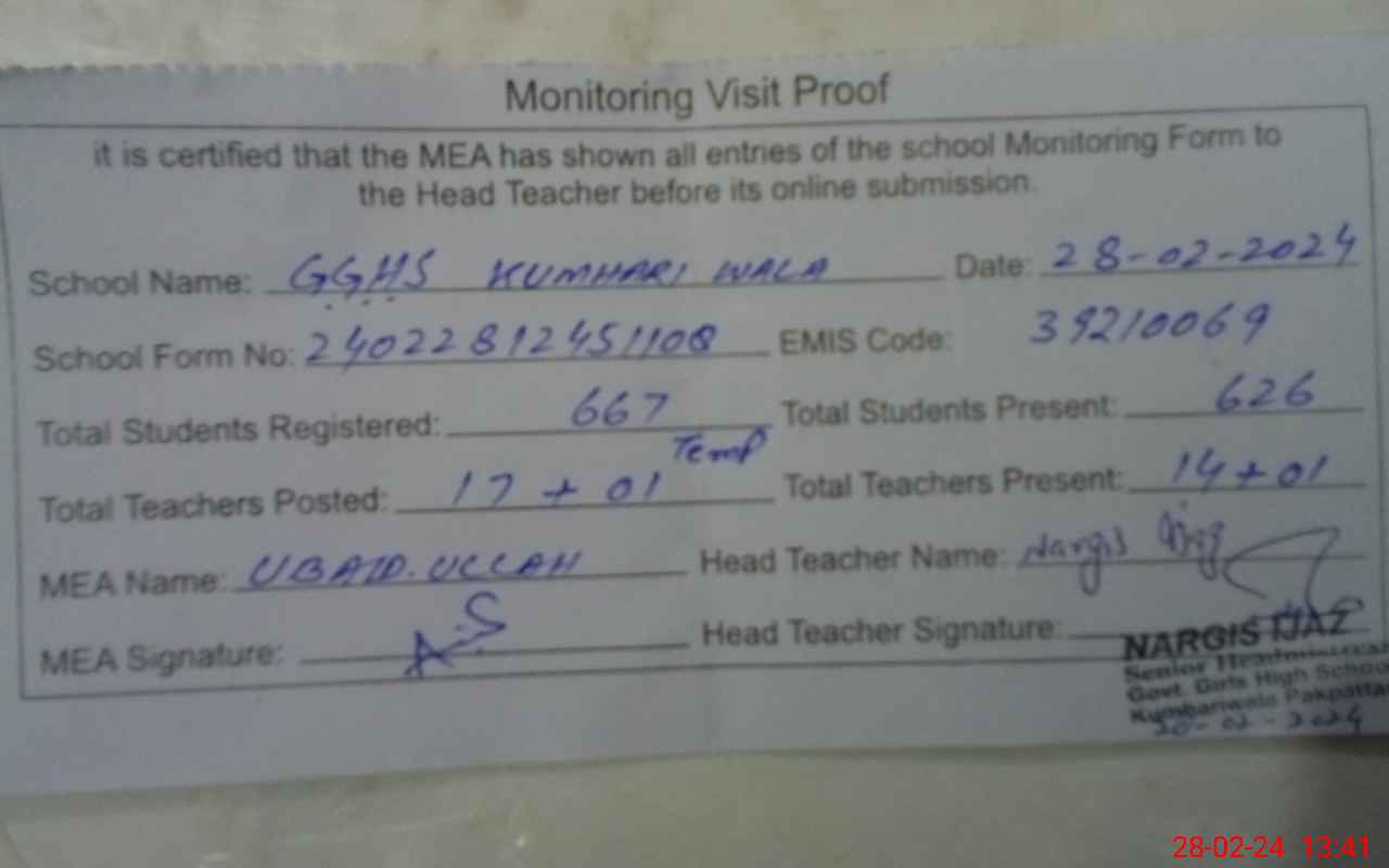 | EMIS Code: 39210069 | Name of School: GGHS KOMHARI WALA | |||