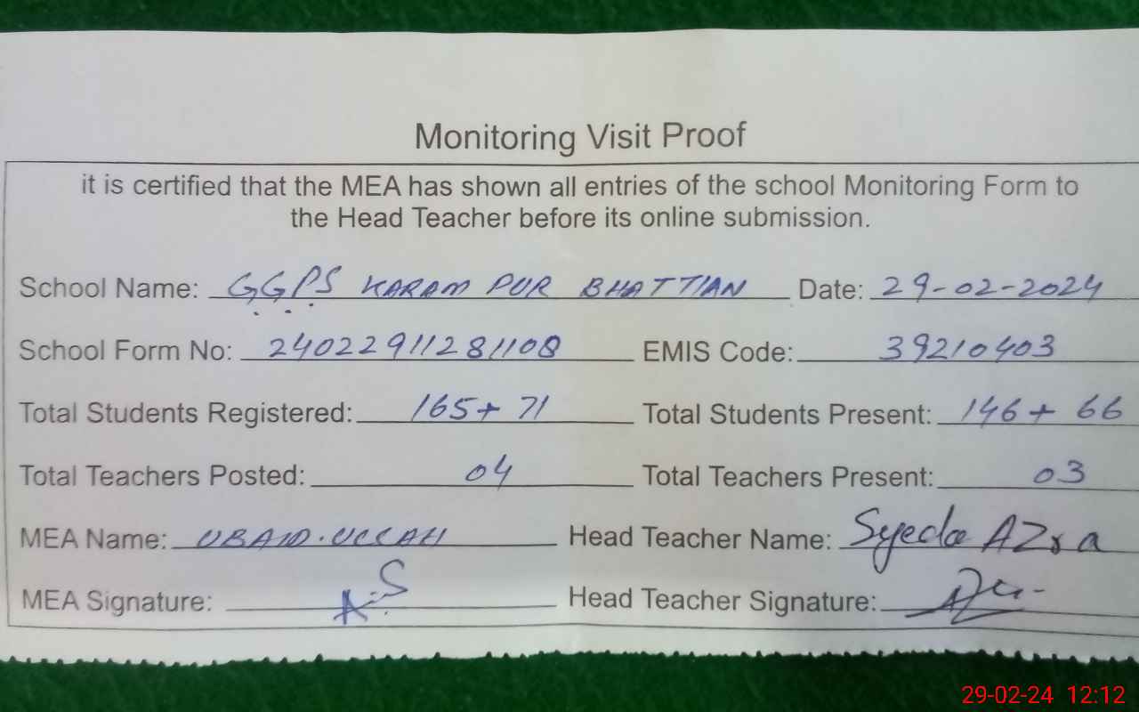 | EMIS Code: 39210403 | Name of School: GGPS KARAM PUR BHATTAIN | |||