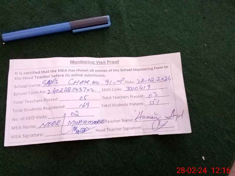 | EMIS Code: 31310419 | Name of School: GMPS CHAK NO 91/NP (After Noon) | |||
