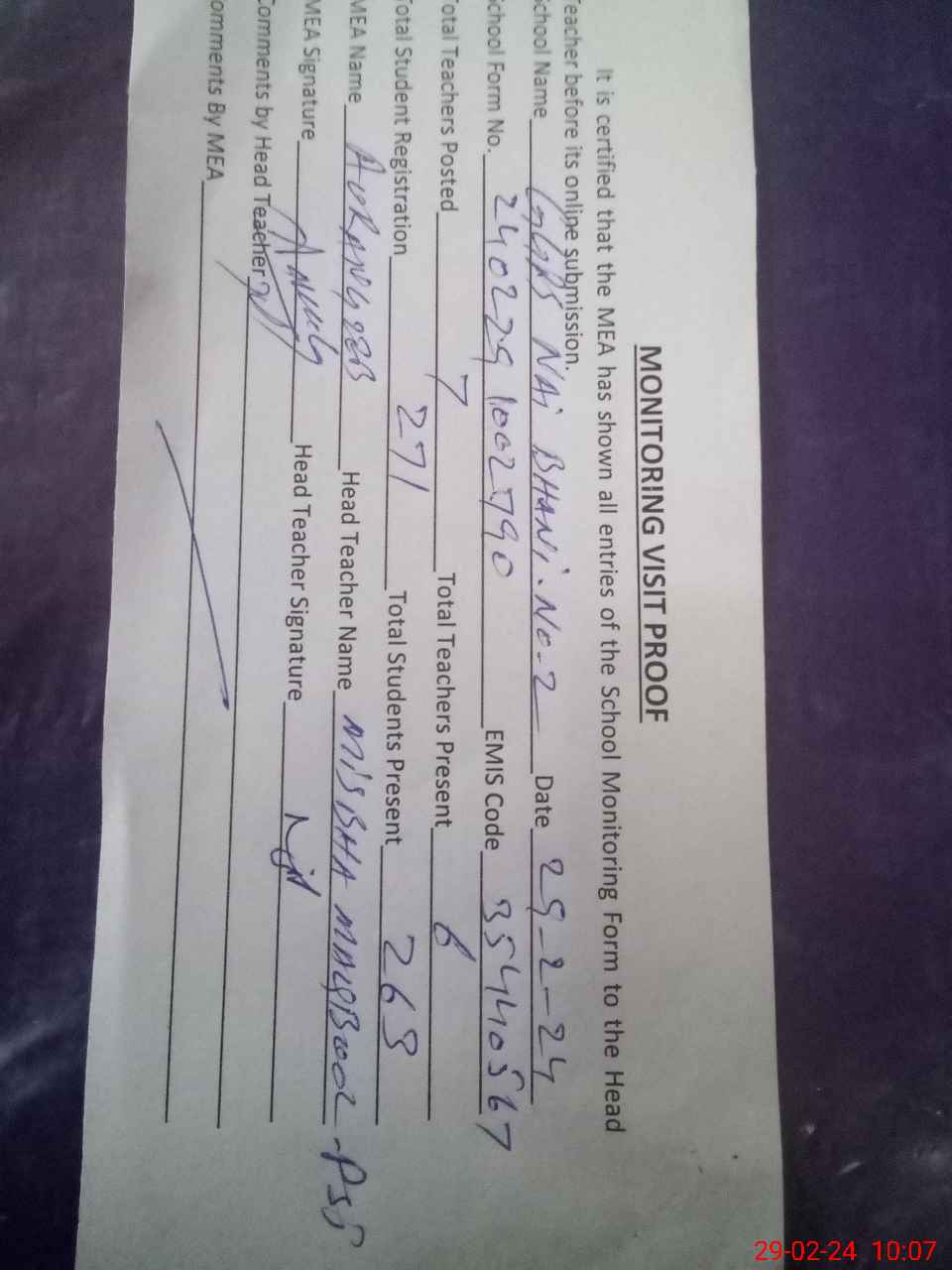 | Certified that this School was Inspected by the Undersigned MEA/DMO Today and the Information Stated Above is as Per Record. | |||||