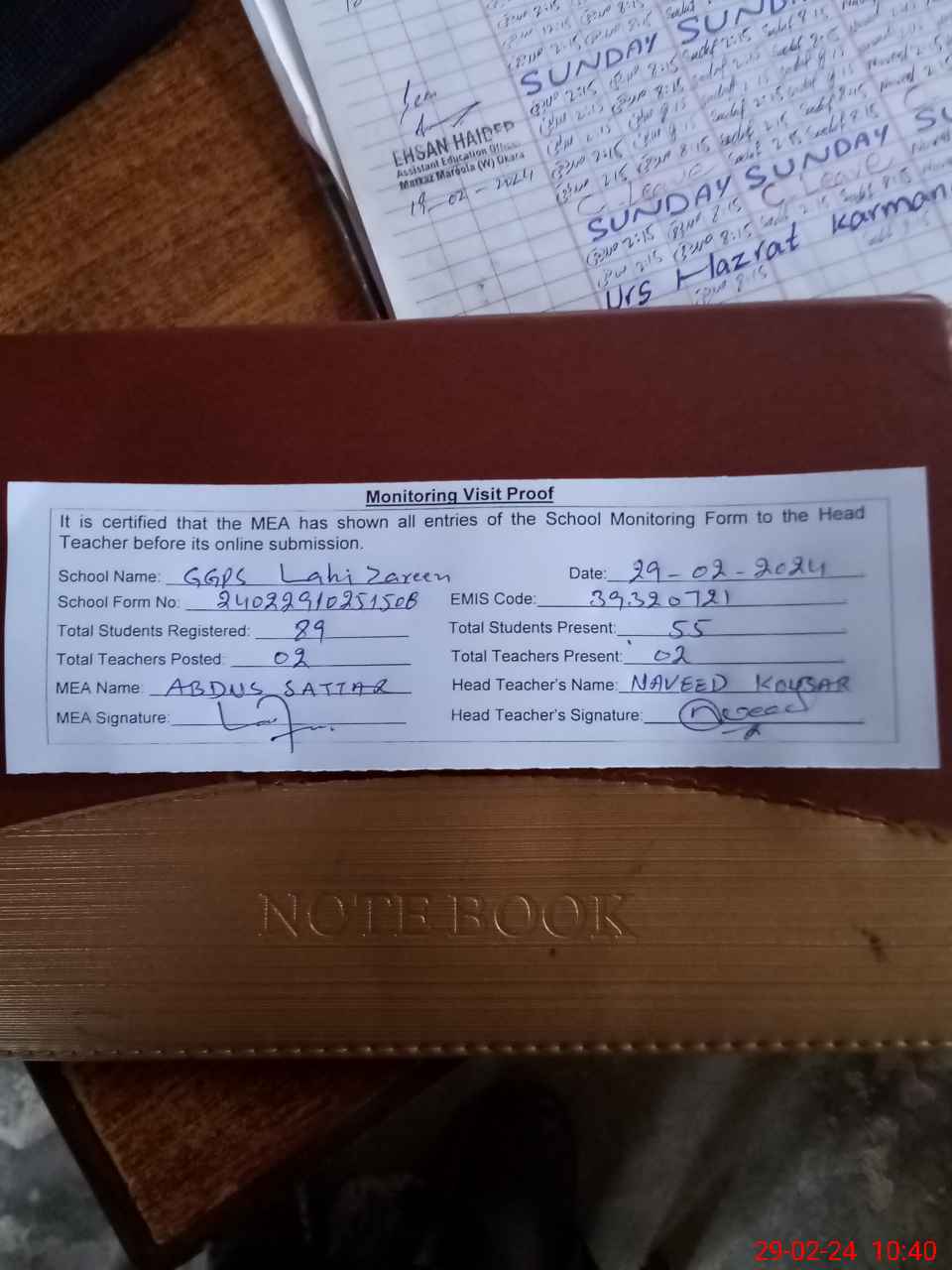 | EMIS Code: 39320721 | Name of School: GGPS LAHI ZAREEN | |||