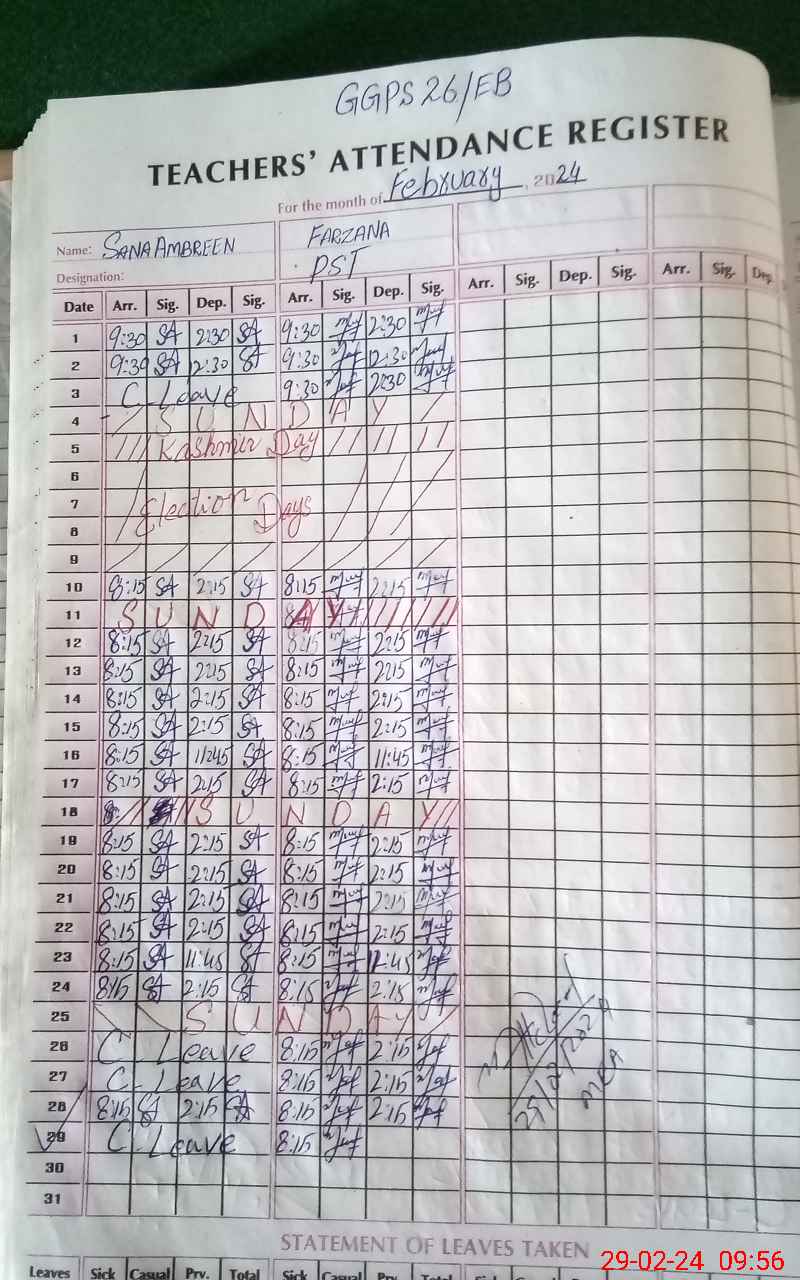 | CNIC | Full Name | Designation | R/C | Absence During Last Calender Month |
